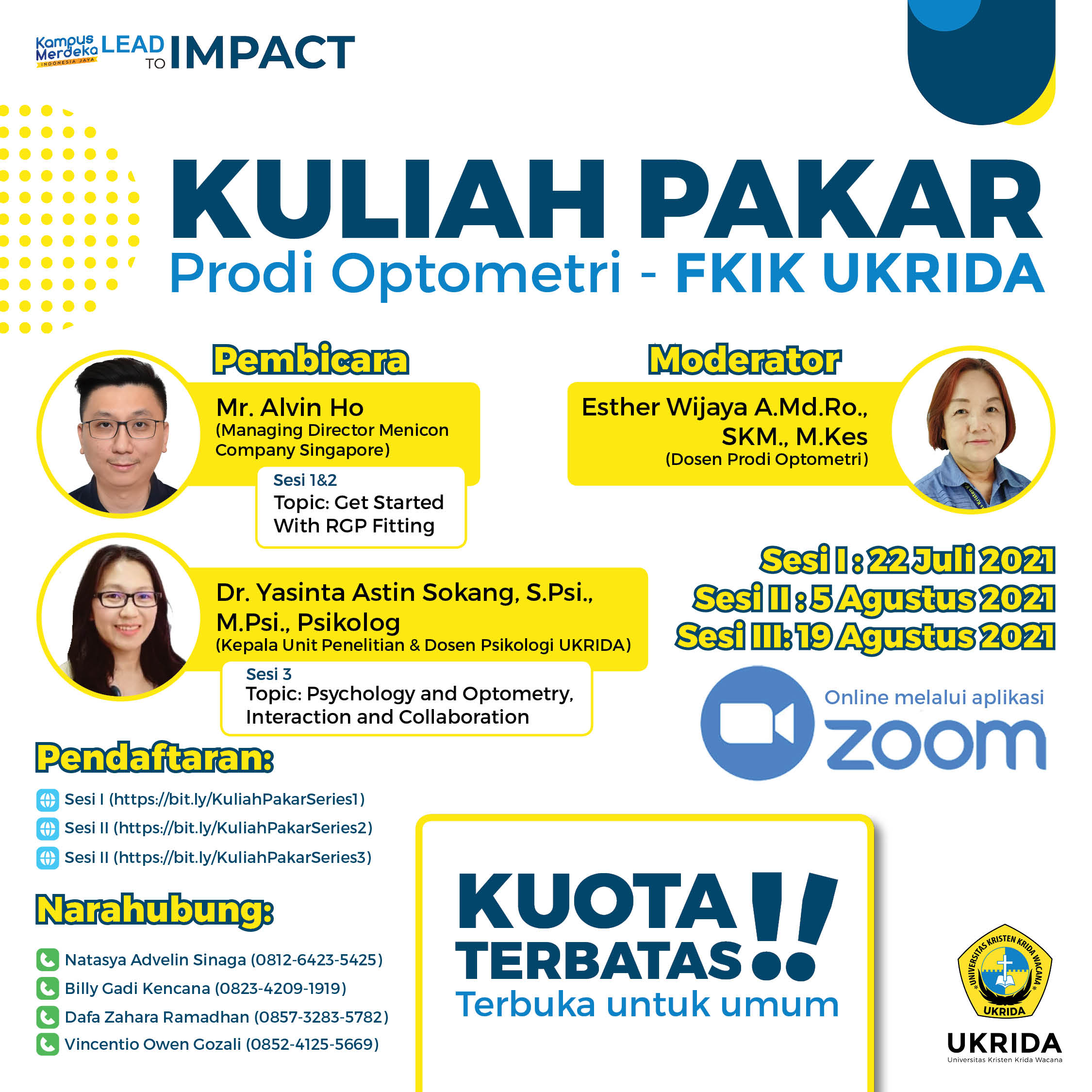 Kuliah Pakar Optometri UKRIDA bersama Menicon Singapore, menghadirkan Mr. Alvin Ho (Managing Director Menicon Singapore). Sesi sharing akan dilakukan secara daring melalui platform ZOOM, dipandu oleh Ibu Esther Wijaya A.Md.Ro., SKM., M.Kes selaku dosen Program Studi Optometri.