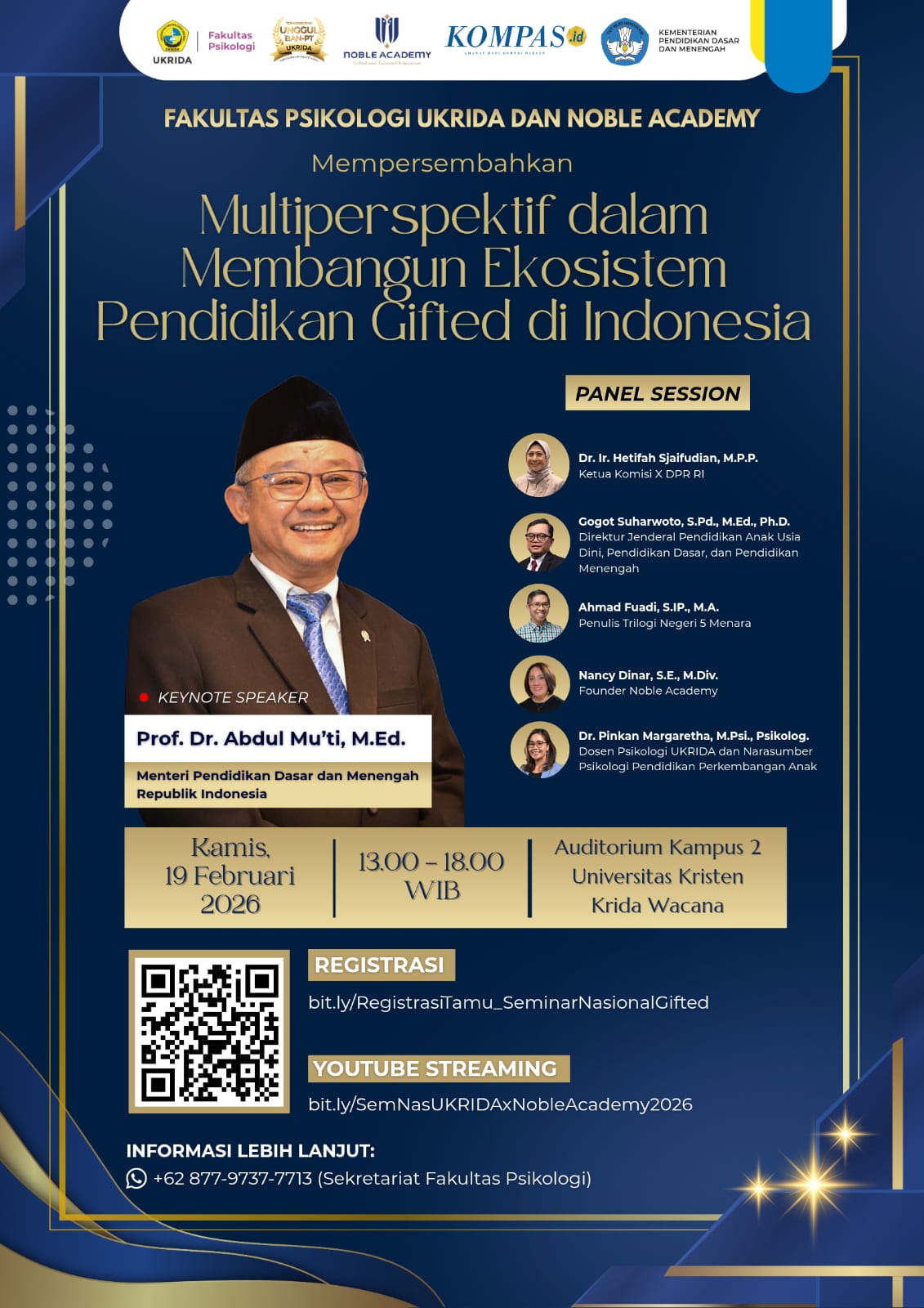 Fakultas Psikologi Universitas Kristen Krida Wacana (UKRIDA) berkolaborasi dengan Noble Academy dan Kompas Grup mengundang Anda untuk hadir dalam Seminar Nasional dengan tema: