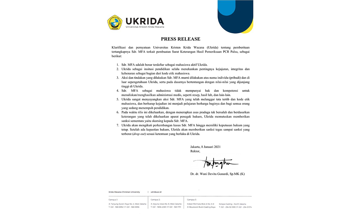 Klarifikasi dan pernyataan Universitas Kristen Krida Wacana (Ukrida) tentang pemberitaan tertangkapnya Sdr. MFA terkait pembuatan Surat Keterangan Hasil Pemeriksaan PCR Palsu, sebagai berikut: