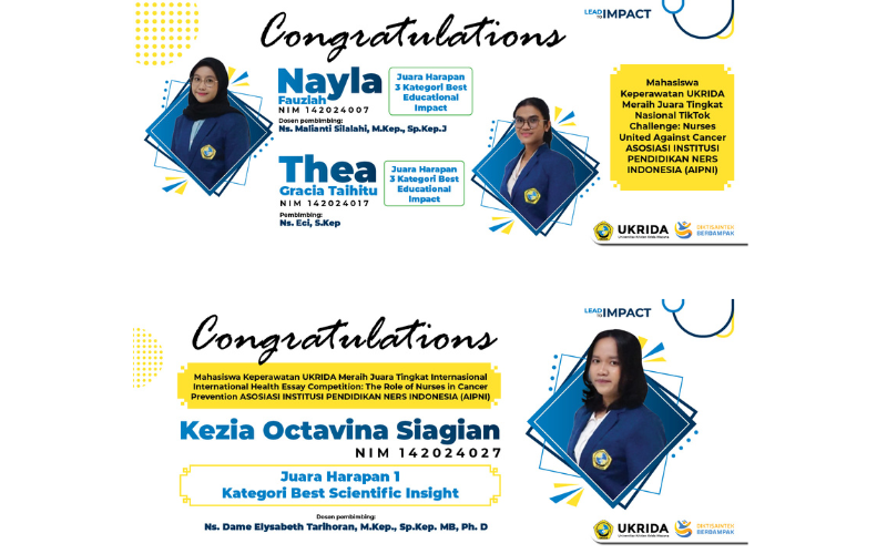 Dengan semangat Lead to Impact, keberhasilan para mahasiswa dan dosen pembimbing menjadi kebanggaan bagi Fakultas Kedokteran dan Ilmu Kesehatan (FKIK) UKRIDA, sebagai hasil dari kerja keras dan semangat kolaboratif. Capaian ini turut memperkuat reputasi UKRIDA sebagai institusi pendidikan yang berkomitmen melahirkan tenaga keperawatan yang kompeten, berintegritas, dan berdampak positif bagi masyarakat dan dunia kesehatan.