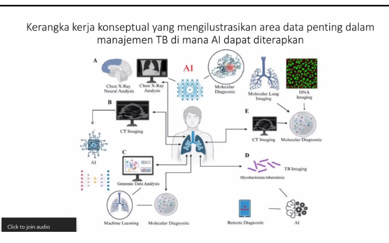 Rangkaian materi dimulai dengan pemaparan dari dr. Chrispian Oktafbipian Mamudi, SpPD-KPMK, FINASIM (Dosen FKIK UKRIDA) yang membahas hubungan 2 (dua) arah antara diabetes mellitus dan tuberkulosis. Ia menjelaskan bahwa pasien diabetes memiliki risiko dua hingga tiga kali lebih tinggi untuk mengalami TB aktif, dan sebaliknya, infeksi TB dapat memperburuk kontrol gula darah. AI berperan penting dalam mempercepat diagnosis serta memantau kepatuhan terapi melalui sistem telehealth.