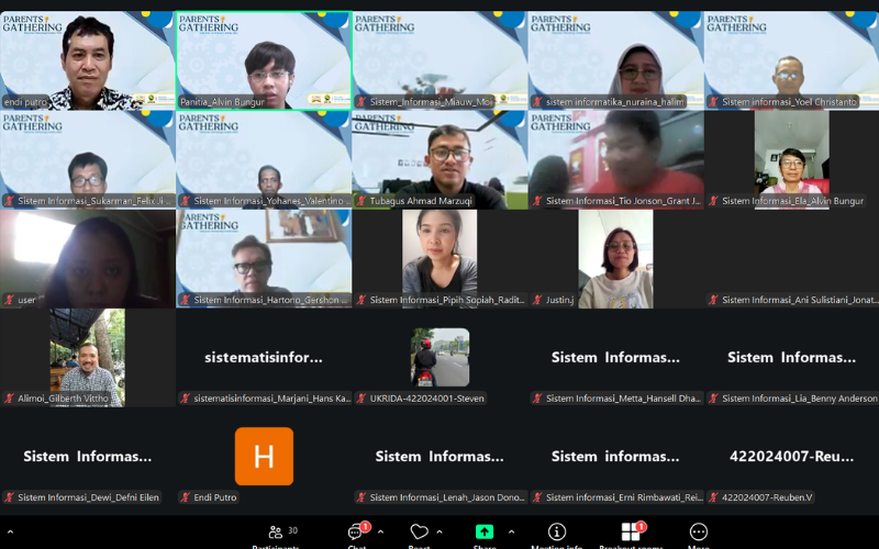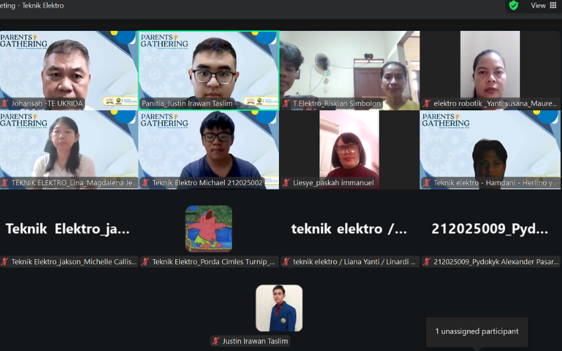 Suasana hangat dan penuh semangat terasa pada acara Parents Gathering Fakultas Teknologi Cerdas (FTC) Universitas Kristen Krida Wacana (UKRIDA) 2025, yang digelar secara daring melalui Zoom Meeting pada Sabtu, 25 Oktober 2025. Acara yang berlangsung dari pukul 09.00 hingga 12.00 WIB ini mempertemukan pihak fakultas dan program studi dengan para orang tua mahasiswa dari berbagai program studi, mulai dari Teknik Elektro, Teknik Sipil, Teknik Industri, Informatika, hingga Sistem Informasi. Kegiatan ini menjadi wadah penting untuk mempererat komunikasi antara kampus dan keluarga mahasiswa, sekaligus memperkenalkan arah baru pendidikan FTC di era teknologi cerdas.