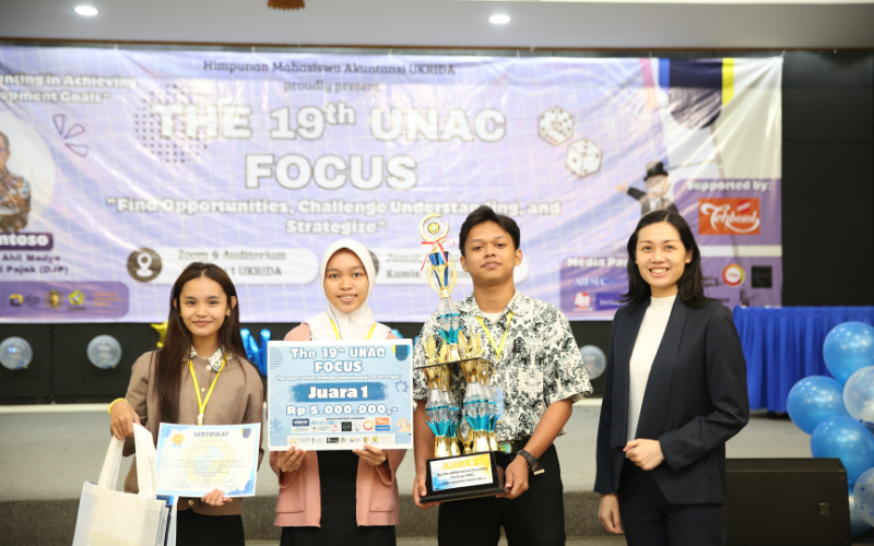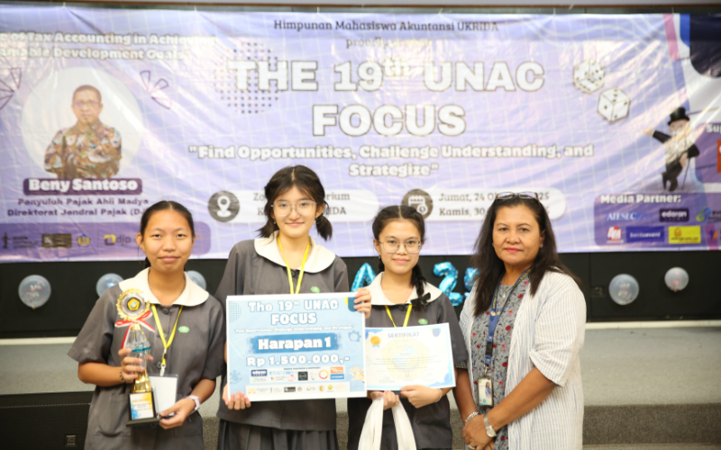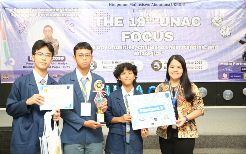Pelaksanaan UNAC ke-19 ini tidak hanya menjadi ajang kompetisi, tetapi juga sarana kolaborasi dan pembelajaran. Melalui kegiatan ini, UKRIDA khususnya Program Studi Akuntansi berkomitmen untuk menumbuhkan generasi muda yang kritis, tangguh, dan siap bersaing di dunia akademik maupun profesional. Sejalan dengan moto Lead to Impact dan tema “FOCUS”, para peserta membuktikan bahwa peluang hanya dapat diraih oleh mereka yang berani menantang diri sendiri serta berpikir secara strategis untuk mencapai keunggulan di bidang akuntansi.