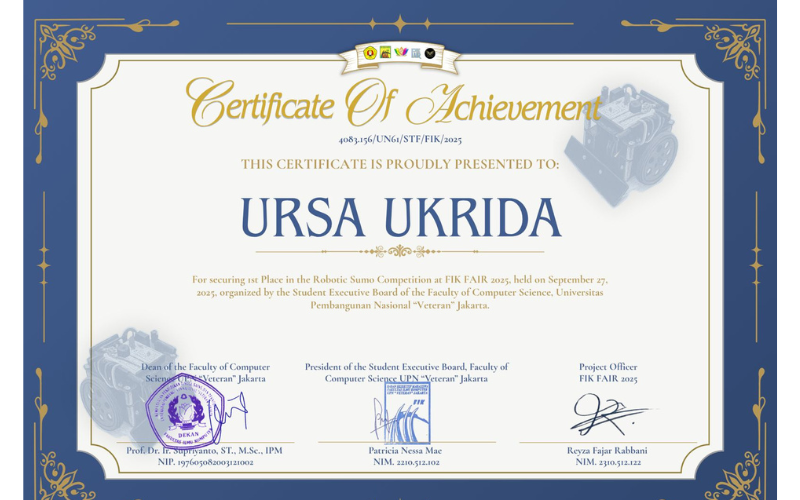 Tim mahasiswa Teknik Elektro UKRIDA meraih Juara 1 pada Robotic Sumo Competition FIKFAIR 2025, yang diselenggarakan oleh Fakultas Ilmu Komputer UPN Veteran Jakarta pada 27 September 2025