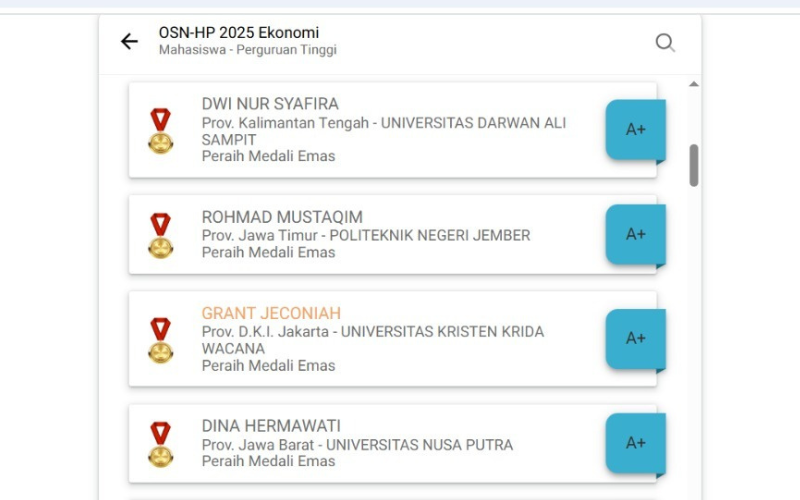 Universitas Kristen Krida Wacana (UKRIDA) mengapresiasi prestasi gemilang Grant Jeconiah, mahasiswa Program Studi Sistem Informasi Fakultas Teknologi Cerdas (FTC), yang berhasil meraih dua medali emas pada Olimpiade Siswa Nasional kategori bidang Matematika dan Ekonomi pada tanggal 30 November 2025.