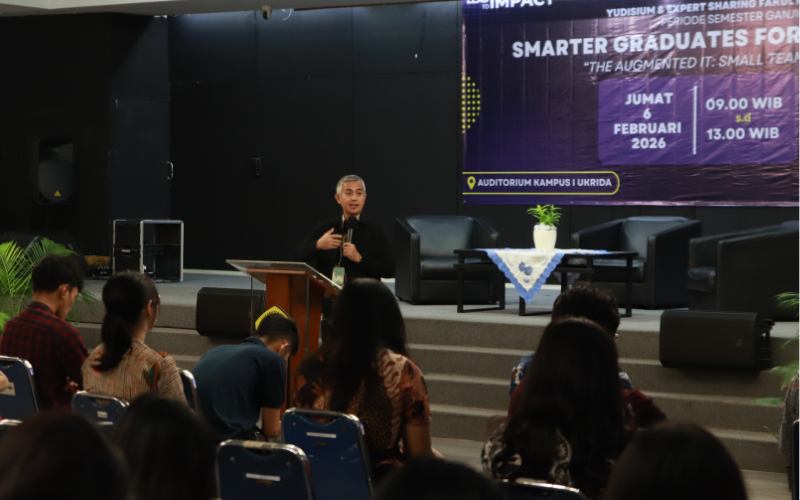 Fakultas Teknologi Cerdas (FTC) Universitas Kristen Krida Wacana (UKRIDA) menyelenggarakan Yudisium Semester Ganjil Tahun Akademik 2025/2026 pada Kamis, 06 Februari 2026, bertempat di Auditorium Kampus 1 UKRIDA. Kegiatan ini diikuti oleh 18 lulusan dari berbagai program studi di lingkungan FTC. Acara ini juga dihadiri oleh sekitar 100 peserta yang sedang menempuh Kerja Praktik dan Tugas Akhir. Mengusung tema “The Augmented IT: Small Teams, Big Intelligence”, yudisium ini menjadi penegasan komitmen FTC UKRIDA dalam menyiapkan lulusan yang tidak hanya unggul secara akademik, tetapi juga adaptif, kolaboratif, dan mampu menghadirkan solusi cerdas yang berdampak nyata bagi masyarakat di era teknologi yang terus berkembang.