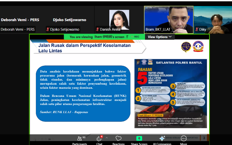 Dari sisi tata kelola, Dr. Ir. Bram Hertasning, S.T., M.T.M., M.Log.Man., IPM., CRP., ASEAN.Eng., Perwakilan Badan Keselamatan Lalu Lintas dan Angkutan Transportasi (BKT LLAT), menilai persoalan ini mencerminkan sistem yang masih bersifat reaktif. “Kita ini sering menjadi pemadam kebakaran. Setelah ada korban, baru bergerak,” kritiknya, seraya menekankan pentingnya penguatan akuntabilitas dan pengawasan yang konsisten. Sejalan dengan itu, Ahmad Wildan, A.T.D., M.T., selaku Pelaksana Tugas (Plt.) Komite Nasional Keselamatan Transportasi (KNKT), menggeser fokus pembahasan pada pentingnya penurunan hazard (potensi bahaya). Ia mengungkapkan temuan kasus di Semarang, di mana kecelakaan yang semula diduga akibat human error ternyata dipicu oleh kerusakan jalan. Menurutnya, penyelenggara jalan wajib memasang rambu peringatan apabila perbaikan belum dapat dilakukan. “Kalau tidak ada tanda, itu pelanggaran. Penyelenggara bisa dikenakan sanksi, bahkan dituntut,” jelasnya. Ia juga mengingatkan bahwa satu prosedur yang terlewat dapat berisiko pada keselamatan jiwa.
